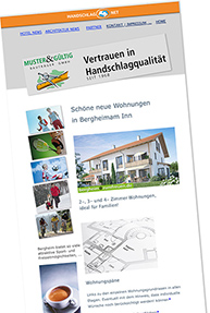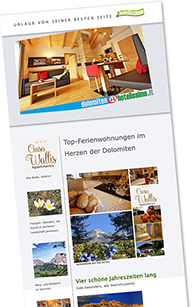 | Ruhige Lage, gute Erreichbarkeit, schönes und angenehmes Ambiente (Stil und Einrichtung) sollen adäquat beschrieben werden. Starke, emotionale Headlines unterstützen interessanten Content! Einfache, günstiige und wirkungsvolle Landingpages machen Lust auf gutes Essen und Trinken, freundlichen Service, typische Sport- und Freizeitangebote, Relax- und Wellnesseinrichtungen, ... Und auf das, was Land und Leute zu bieten haben. Zum Beispiel > |