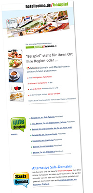 | Alle können sich die einfach besser merken! Mit "ja@okso.de" auf die Frage nach der eigenen e Mail Adresse zu antworten oder "immobilien.zumfreuen.at" als URL anzugeben, ist ein Statement und kleine Geschichte, wirkt engagierter und professioneller als schwer merkbare Alltags-Domains! ![]() Semantische Domains machen Werbung mit e Mail Adressen und SubDomains möglich. Am Firmenfahrzeug, als Inserat, ... fallen sie mehr auf und alle merken sie sich besser! Probieren Sie's einfach aus, senden Sie eine Test-Mail an die oberberg@hotelissimo.de |
